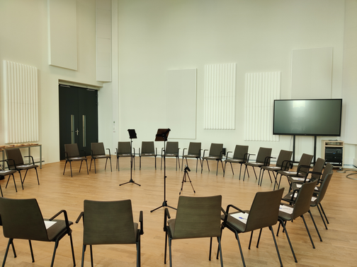 For this experiment, I decided to have the performers playing back to back, the audience sitting in a circle around them. The music allows for great flexibility so that the players can react to the setting and to each other without having to worry about being exactly together at any given time. This translated itself into rather lengthy verbal instructions in the score, which make for a less intuitive reading. However, this allowed us to memorise the instructions and, when performing, to only focus on the few notes that are written on the score, and on the coloured words as indications of when to move on to the next section. In the analysis, I included fewer examples from the score, as these are not easy to relate to the auditory result, which is what is most relevant here.