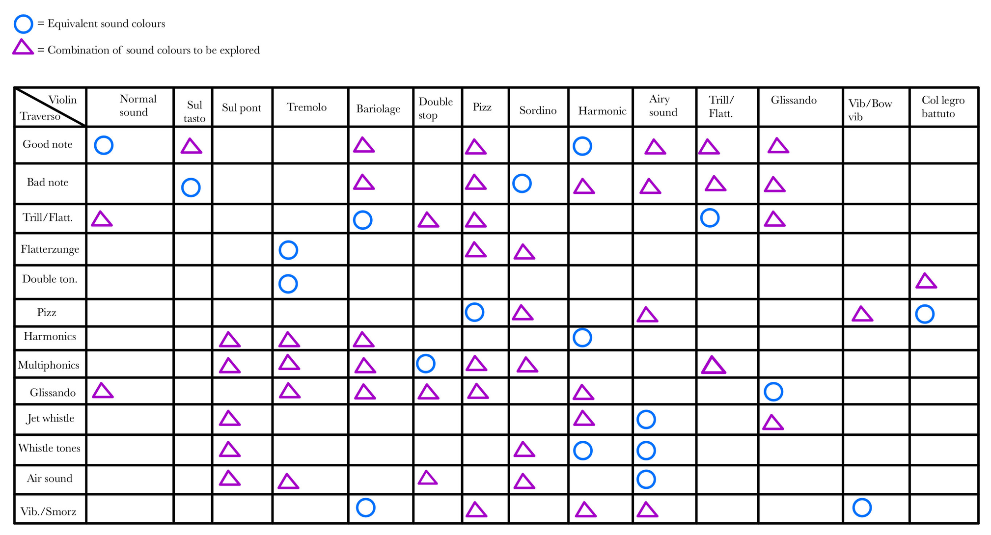 Finally, before I get into the detailed analysis of all the music I composed as part of this research, I would like to reflect on the table I include below. Drawing it was one of the first things I did when I started thinking about composing for the traverso and baroque violin, and it gives an oversight of the different extended techniques (the ones I was interested in, at least) for each instrument. The blue circles represent sounds that I classified as "equivalent" between the two instruments, while the violet triangles represent combined sounds that I thought might be interesting to explore. This table was extremely useful when composing the music for the two experiments, as will be described later. It is also interesting because of the visual adjacency it establishes between the sounds of the two instruments (further discussed in the section Mediating elements during the creative process).