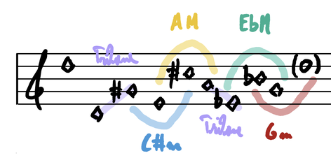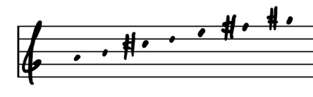 Since both the acidic and bitter tastes correspond with dissonant harmonic and melodic intervals, and the presence of these two tastes decreases from dish to dish, I decided to start with a fully chromatic selection of pitches that gradually become more diatonic.