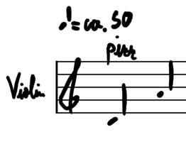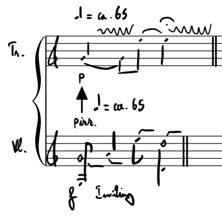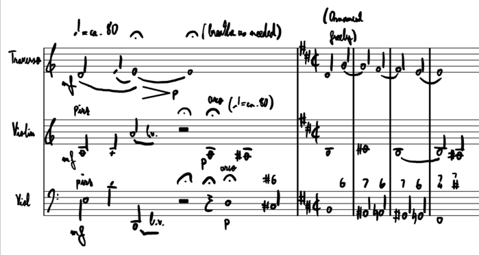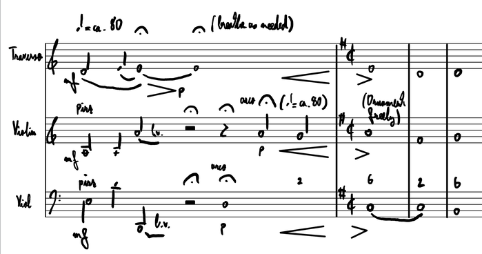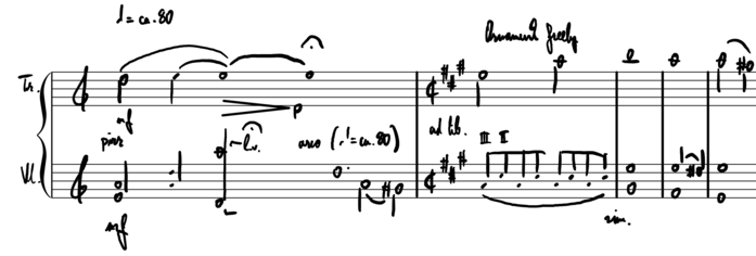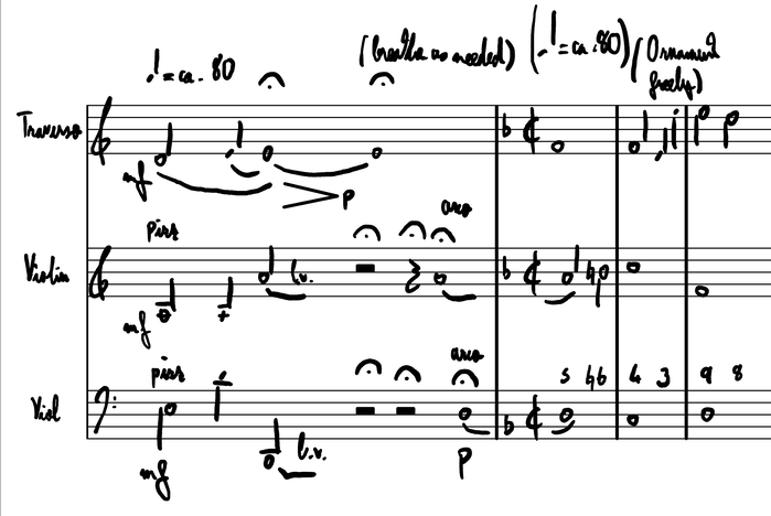 Over the suspended D harmonic, the flute begins to introduce a series of pitches that will reappear in later parts of the piece. These pitches were chosen to be comfortable on the traverso when changing from one to the next, and they hint at triadic harmonies. The violin, while maintaining the suspended D, plays the cue as a left hand pizzicato.