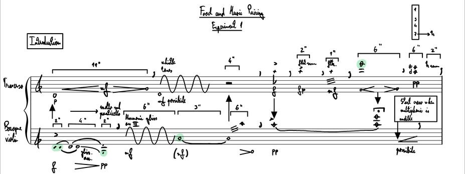 The idea of the Introduction was to present the four pitches of the musical cue while at the same time hinting at material that would be associated with specific basic tastes later on in the piece. Firstly, the pitch D is introduced in both instruments, then the G with the violin glissando, in what will constitute the musical material for the bitter taste. Immediately afterwards, the A is introduced as a partial of D in the harmonic glissando of the violin and then the whistle tones of the flute, both elements crystallising in the A harmonic of the violin. The flute plays an A5 with different articulations and lengths, hinting at the material corresponding to the acidic taste by playing one of them with flatterzunge. The remaining pitch, E, is then introduced by the flute, to be taken up by the violin in a harmonic double stop that will reappear later in the piece corresponding to the sweet taste. A traverso multiphonic is played within that double stop, which will also come back corresponding to the sweet taste. The cue is then played to indicate to the audience that they can start eating the first dish.