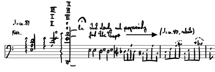 Given the long time that passed between the previous dish and this one during the performance (we moved to a different room for this part), I did not consider it necessary to start in the previous key. Therefore, the prelude begins directly in a pandiatonic texture in A major. After the violin introduces an arpeggiated A major chord, somewhat hidden by the dissonances the flute plays against it, a progression begins in which the violin plays double stops with slowly ascending glissandi, and the flute expands on the triadic arpeggio idea of the violin. The two instruments end on a new chordal constellation of the three notes of the cue.