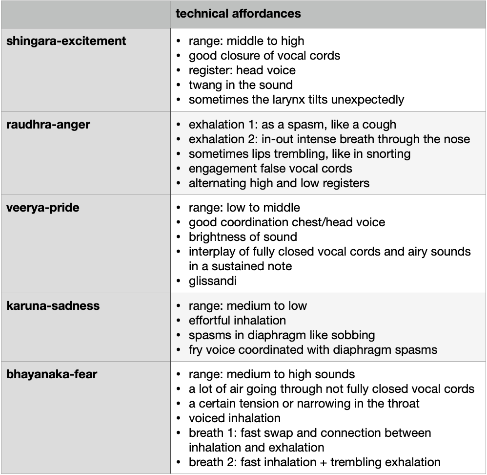 In my own experience, the specific exercises to embody an emotion, present in the Navarasas, can generate a strong sensation which in turn has an influence in the body and in the voice. With the experiment presented after I attempt to observe how this emotional embodiment influences my voice in more detail.