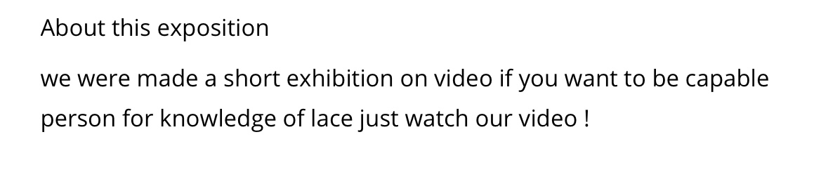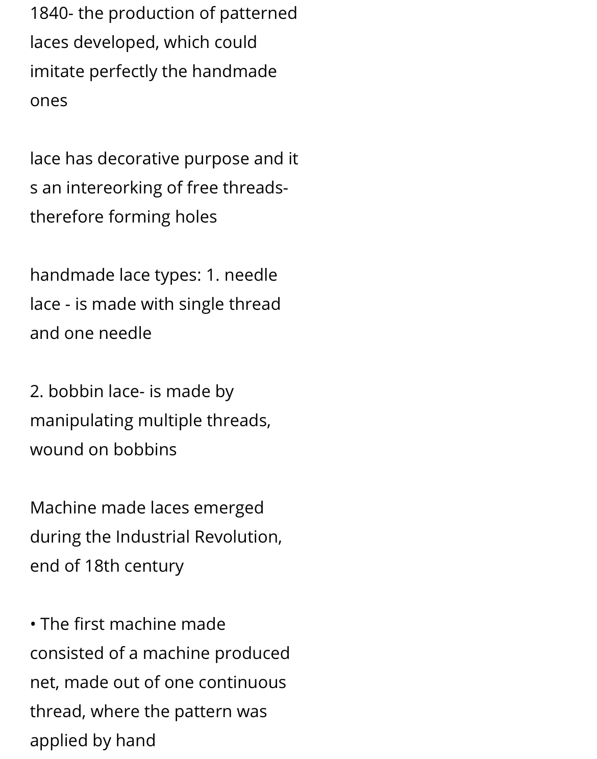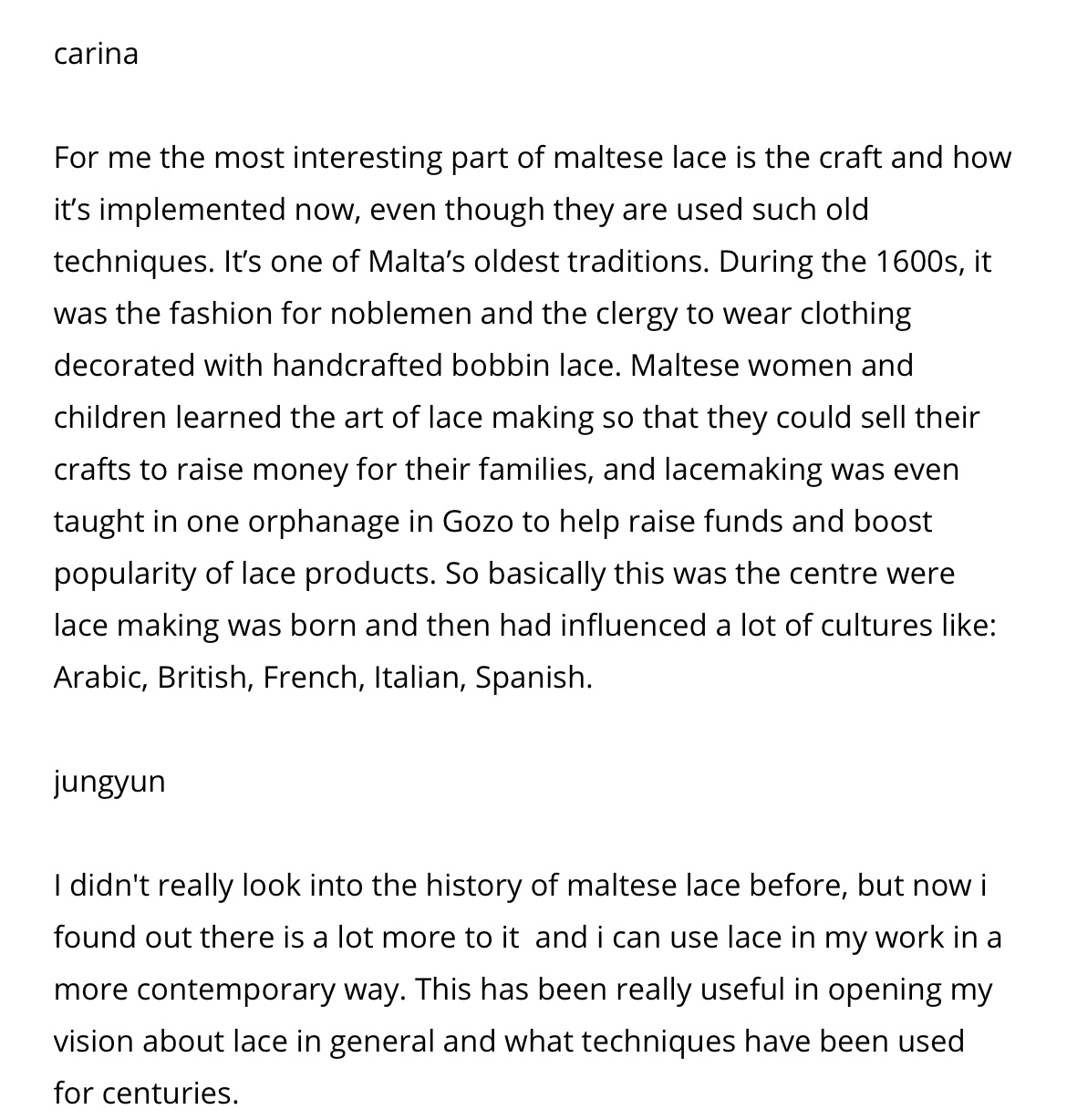 we were made a short exhibition on video if you want to be capable person for knowledge of lace just watch our video ! 1840- the production of patterned laces developed, which could imitate perfectly the handmade ones lace has decorative purpose and it s an intereorking of free threads- therefore forming holes handmade lace types: 1. needle lace - is made with single thread and one needle 2. bobbin lace- is made by manipulating multiple threads, wound on bobbins Machine made laces emerged during the Industrial Revolution, end of 18th century • The first machine made consisted of a machine produced net, made out of one continuous thread, where the pattern was applied by hand carina For me the most interesting part of maltese lace is the craft and how it’s implemented now, even though they are used such old techniques. It’s one of Malta’s oldest traditions. During the 1600s, it was the fashion for noblemen and the clergy to wear clothing decorated with handcrafted bobbin lace. Maltese women and children learned the art of lace making so that they could sell their crafts to raise money for their families, and lacemaking was even taught in one orphanage in Gozo to help raise funds and boost popularity of lace products. So basically this was the centre were lace making was born and then had influenced a lot of cultures like: Arabic, British, French, Italian, Spanish. jungyun I didn't really look into the history of maltese lace before, but now i found out there is a lot more to it and i can use lace in my work in a more contemporary way. This has been really useful in opening my vision about lace in general and what techniques have been used for centuries.