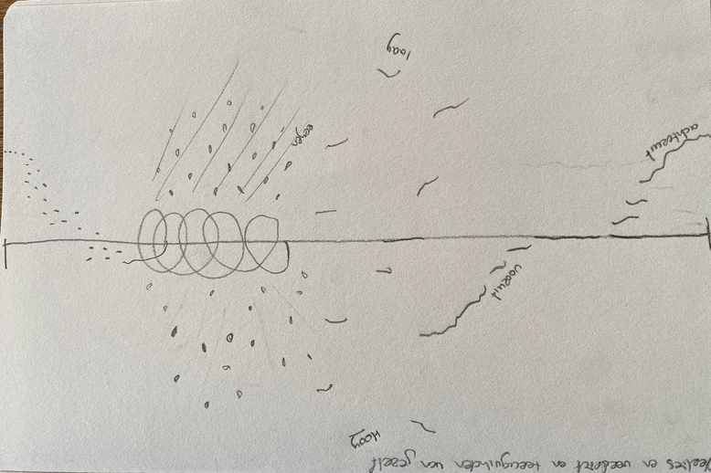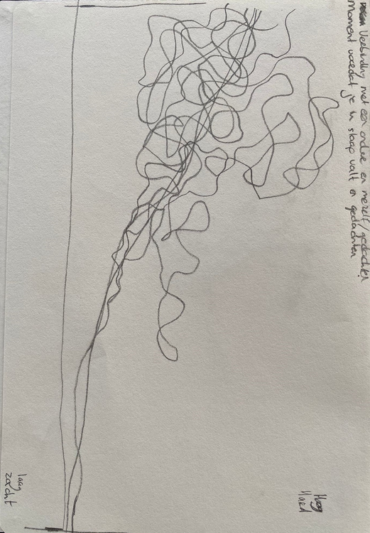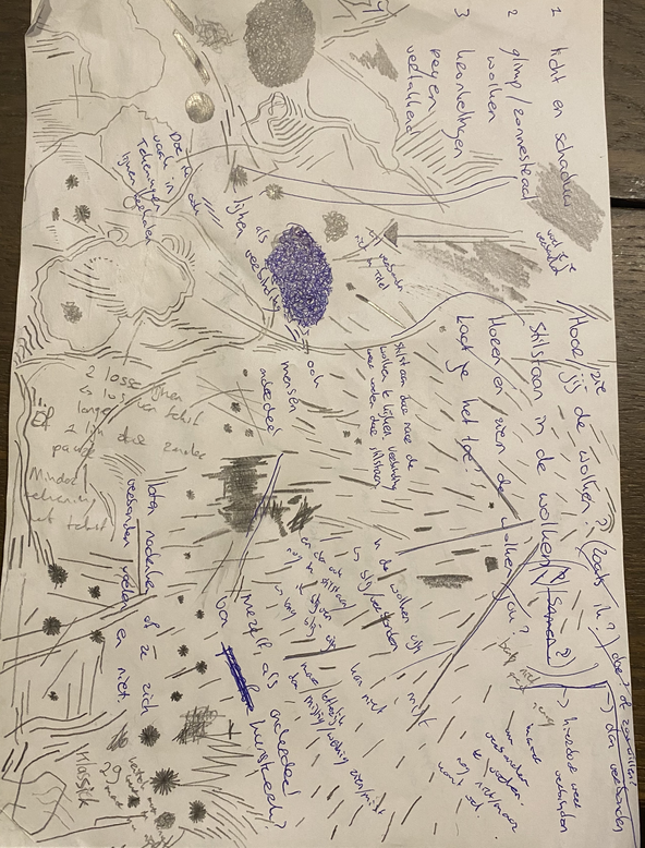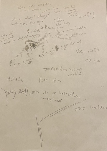 In this experiment I wanted to start creating music to written texts of mine. This seemed like a good starting point for me to experiment with connecting different media. But how did I want to start creating music inspired by a text? It occurred to me that when I make a clay work, for example, I do not just start claying. So I thought about creating an intermediate step between the text and creating music. I tried to turn the text into a graphic sketch with a kind of timeline. A visual intermediate step. During a course I took at the Royal Academy of Art The Hague (KABK), Orientation course; January untill June 2021, I gained experience in making a graphic score and creating music on a graphic score. This inspired me to start experimenting with my own texts. The connection of the visual with sounds. In this way, I worked on three texts and I tried to play on my clarinet with the graphic score in front of me. However, it did not succeed the way I had hoped. Not much came out of me in terms of playing and improsing on the clarinet. After trying for some time I stopped the experiment. I think it was a good experiment in the sense that I learned what did not work. I had come a step further.