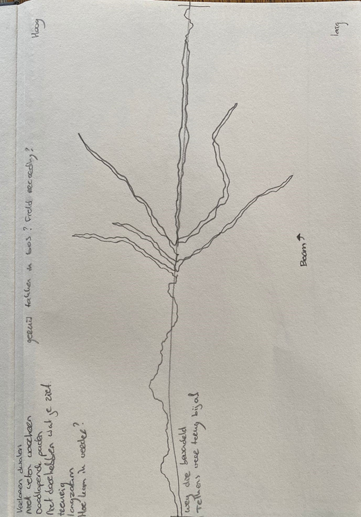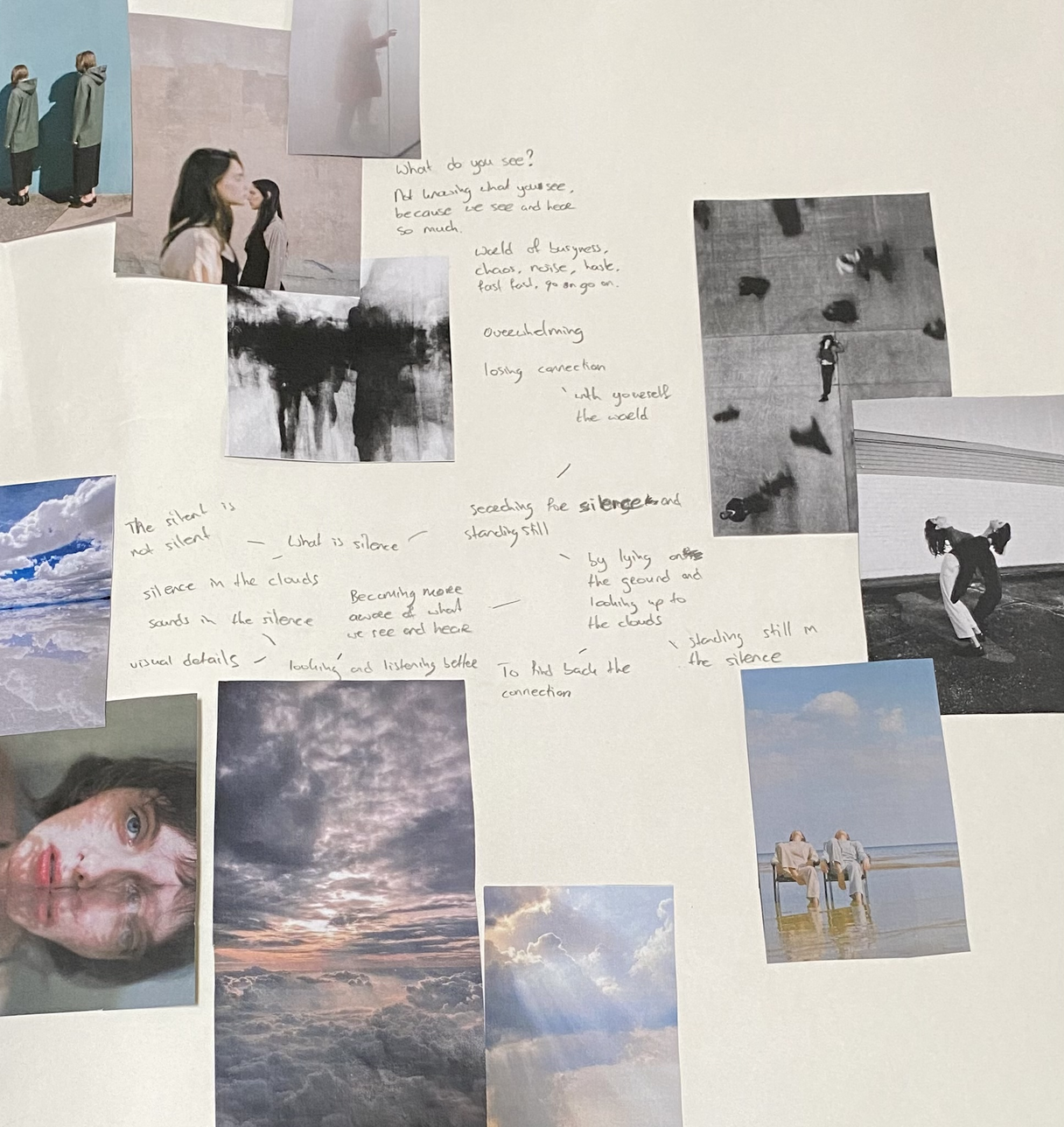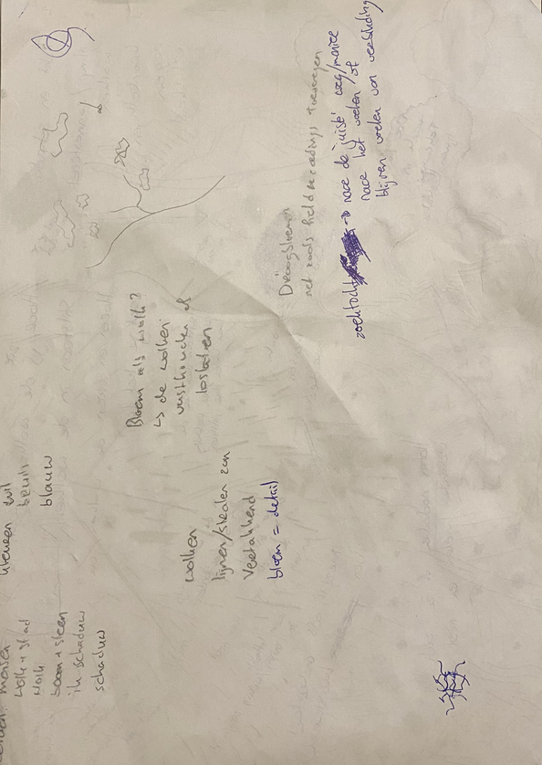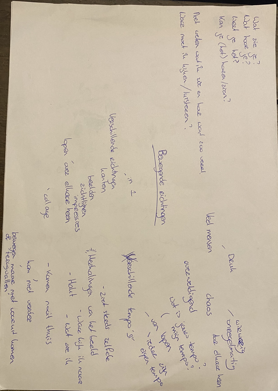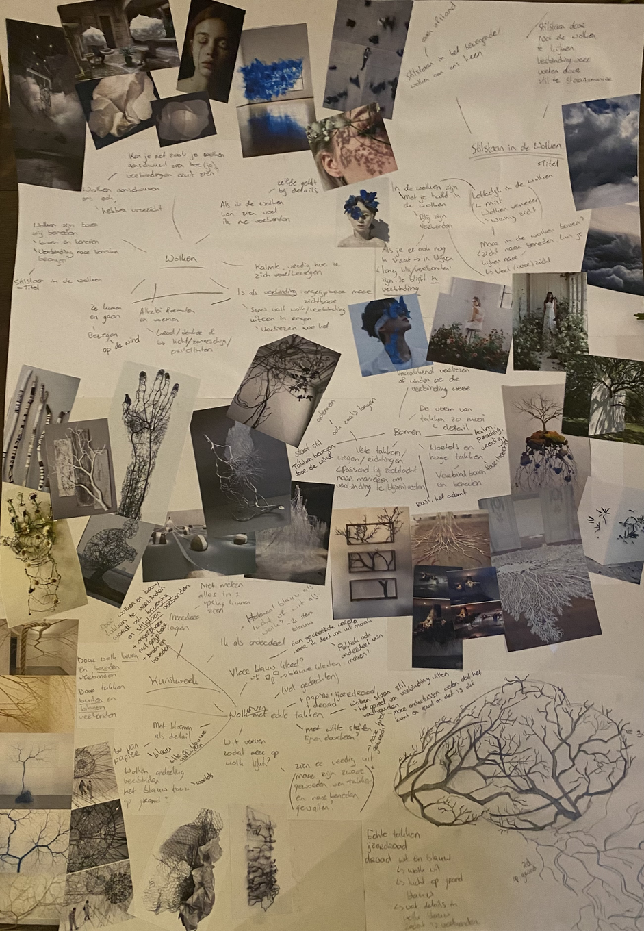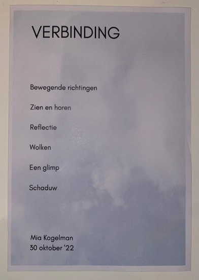 The two works, Schaduw and Glimp, fit well with these points. Shadow fits with feeling the connection and Glimp fits with how to feel connection. The two works leave room for own interpretation, which I like about them. Then I searched among the rest of my written texts. I picked out a few texts that I liked and thought would fit; the text Wolken and a part of my very first written text of this project. This first text contains many questions in which I want to invite people to think. An introduction to my topic. Connecting. Feeling connected. With the points in my head that I want to incorporate into the performance, I started creating the following works.