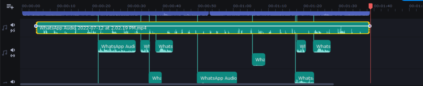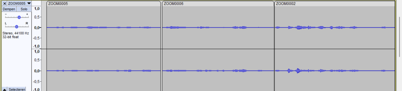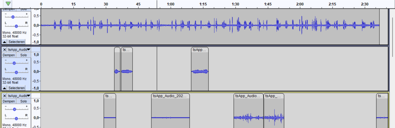 As we can see in the visualisation of the recording in the audio processing software Movavi Video Editor, the audio of this work Schaduw is composed of different voices, or lines.The following shows the different sounds of each line.