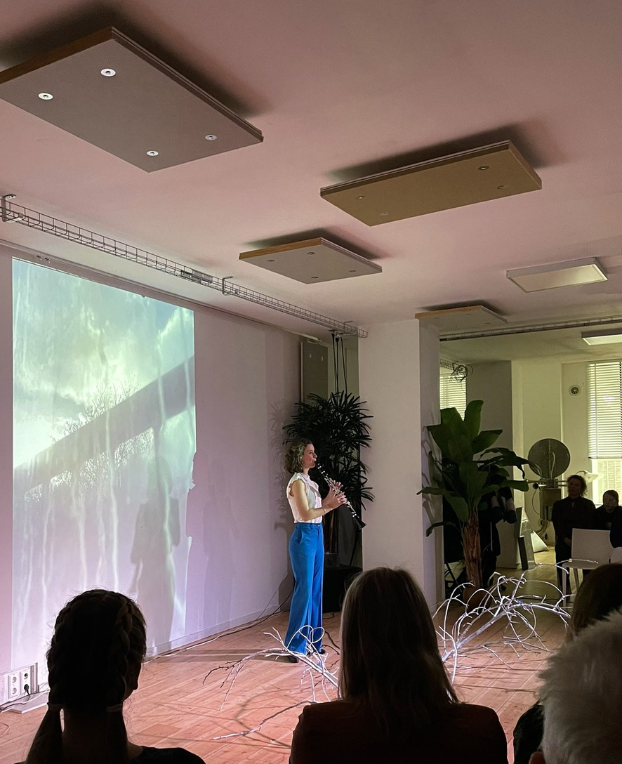 In the beginning sessionsI found it very difficult to get myself to lie down on the floor and play the clarinet. I thought I still have to study this and do that. I did not quite allow myself that moment on the floor. However, in the last few sessions I noticed that I stayed on the ground a bit longer and that I was less distracted by, for example, my arms being tired and by all the thoughts in my head and the things that I needed to do. I felt more stillness in me. I was more in the moment and I was more in the mindset to play unconsciously and to improvise a bit, instead of exercises or existing pieces. So, by doing this experiment I also learned about myself and about the theme of the performance. After this, I focused more on other things and I did not pick up and continue the experiment later. However, it was a first step in exploring my own sound world.