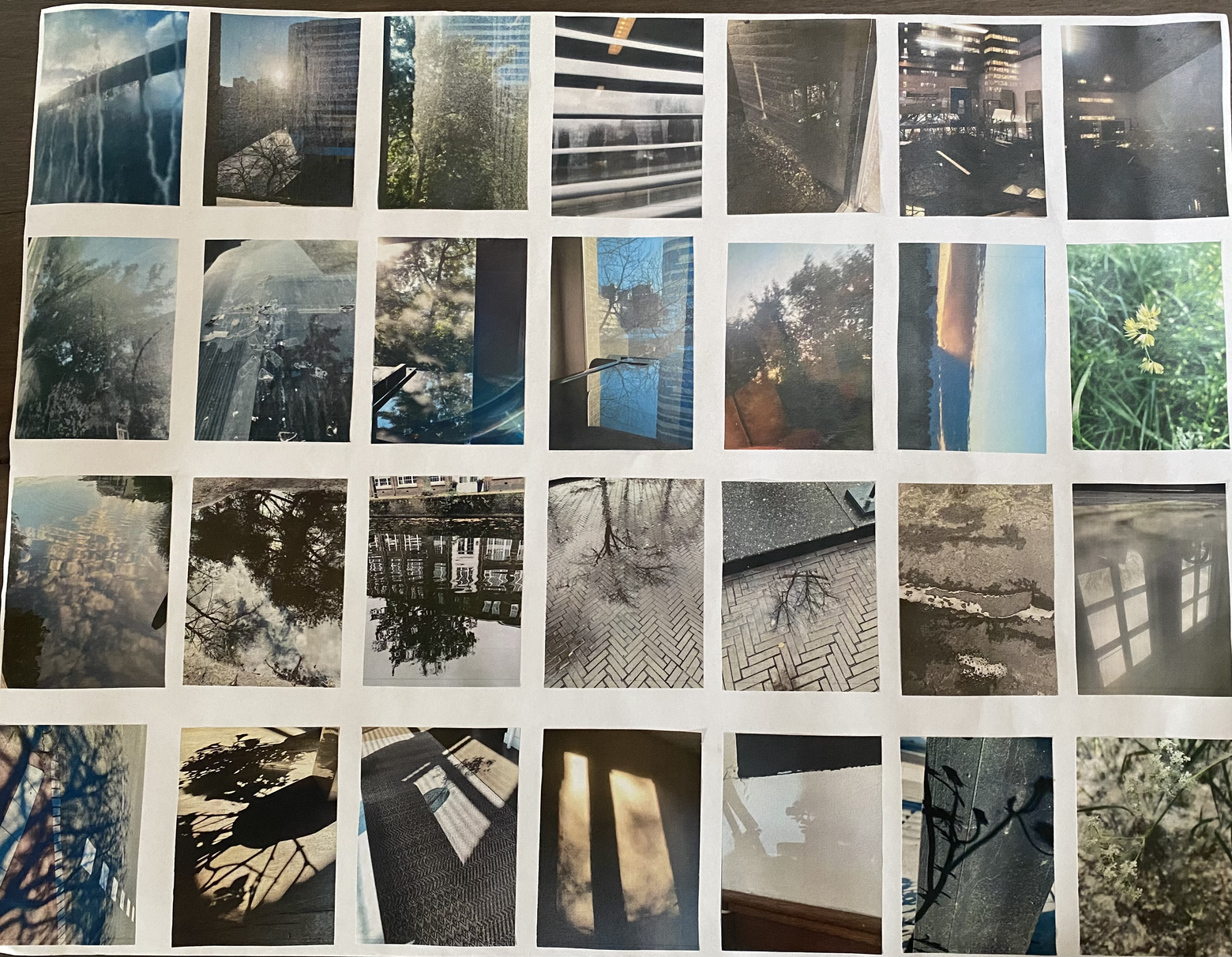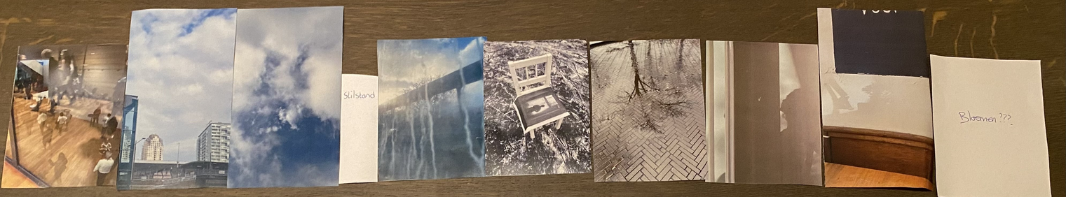 I took and collected photographs that fit the defined atmosphere of the performance, with the thought in mind that I could use this material in the performance later. At one point I wanted to see what kind of photos I had taken and collected so far. I did this by making an overview on an A2 format poster. It gave me a chance to look at the photos side by side. You see pictures with little details, like shadows, reflections and hidden worlds. It fits with being able to see and to hear again, because of feeling the connection. You see also a lot of trees. Trees have always interests me. I find them beautiful, the shape, the peacefulness.