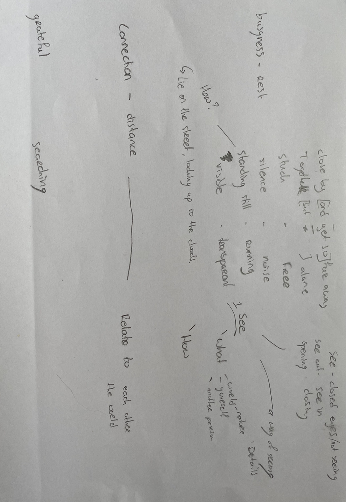 In this text I tried to express everything that kept me busy and the ideas that wandered in my mind. It is about how we look at things, how I look at things. What do you see? A lot of questions. The text is about how I feel. The world feels overwhelming to me sometimes. It is about connection and how to feel connection. About me losing the feeling of connection. How can I keep feeling the connection when I feel overwhelmed?