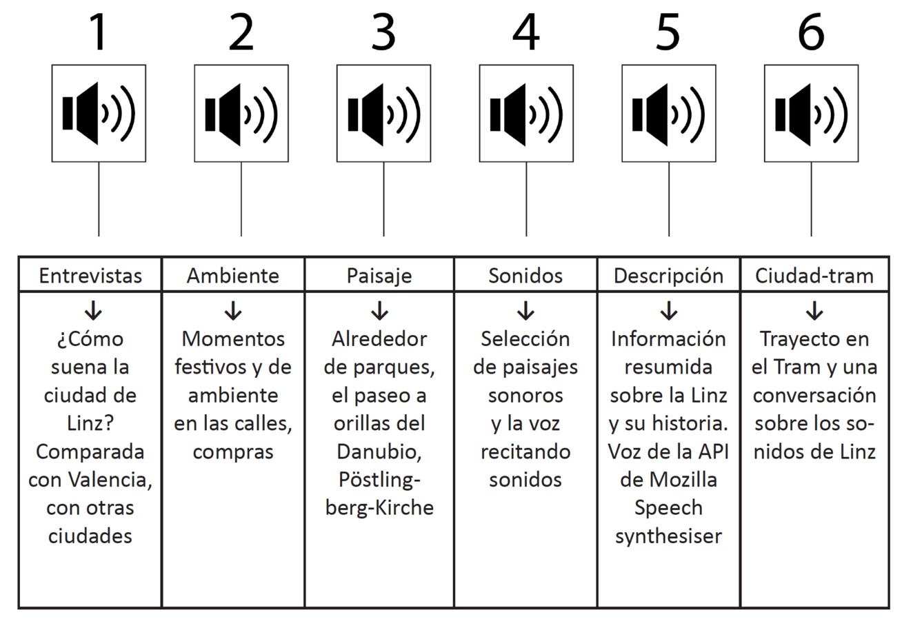Se compone de un panel de 100 x 50 centímetros y una proyección de la imagen del mapa de Linz, Austria. Los altavoces se agrupan en seis canales con sonidos de la ciudad que interpretan la experiencia de recorrer el lugar y escuchar sus sonidos. Se establece una comparativa con Valencia a través de unas entrevistas a artistas que han estado en ambas ciudades.