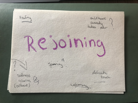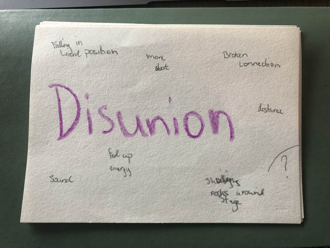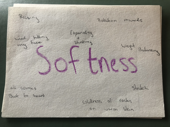 I dont really know what happened but it just because easier to relay my thoughts and visions of the piece. what also helped with this was the cards i made for myself during the first process. i made these mindmap cards to help me embody the qualities and intentions of each section of the solo. So, after each section i would give Julia the card that related to the section we just learned. It became a good reference point for me to teach the choreography from.