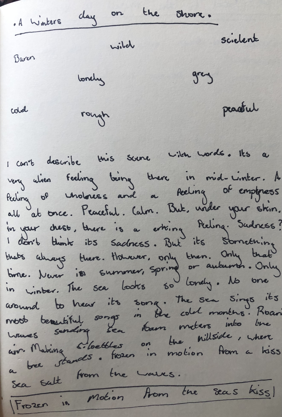I drove up there on a very windy and rainy day to collect seaweed for the garden. As my parents slaved away scooping seaweed into a trailer, I went on a walk around a small island connected to the mainland by a tidal causeway. I first observed the surrounding. The sea and the sky were blending into each other with a mutual grey, but you saw a small separation because of the white horses rising on the waves. There was a small old cottage that was placed in a cove, with its own little harbour on the other side of the bay. And beyond yonder, you could see the tops of hedgerows and trees bent backwards by the wind and frozen by the salt of the sea.