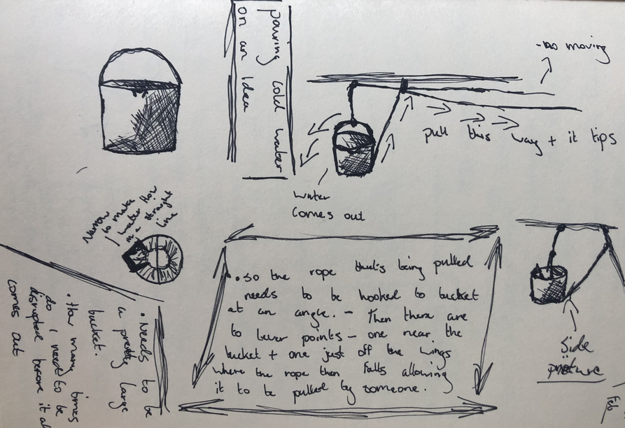 I wanted to approach this piece from a dancer’s perspective. I wanted to make it feel good to dance before worrying about the dramaturgy and intention of the piece. I noticed a lot of resistance to dance in a way that made me feel good. Like my body was afraid of letting something feel good. And for a period, I played with the idea of an outside force interrupting me while dancing. At first, I tried with a sound stopping me, but that seems too obvious. Then I wanted an actual physical thing to stop me. So, I though why not water? The idea was that every time I started to move and get into something, water would trickle onto my head from a bucket attached to the ceiling of the theatre. I even went as far as to design a contraption to make this scene a reality. Even going as far as doing maths and considering buying a bucket and a welder.