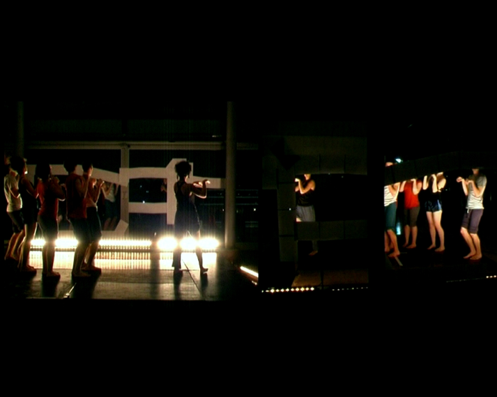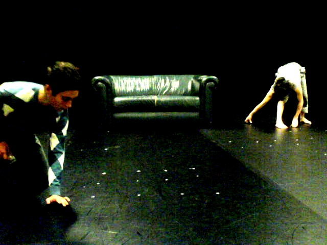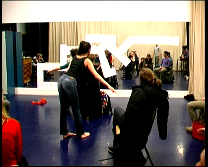 is the third element of this project. At the beginning I have been working with the sofa. I was looking at the causal effect that happens through mutual sensing between the body of the performer and the body of the sofa. This means that not only humans can (physically) sense objects, but also objects can “sense” humans. The sensing of objects results in a physical change of their shape or condition (e.g. a chair becomes warm while a person is sitting on it, a scarf becomes creased by the use of a person, etc). In this inter-relation between humans and objects there is a zone in which I am particularly interested. This zone is where the borders between the human body and object body become blurred. In this place where it becomes unclear, do I move the chair or does the chair move me, am I making the bed or is the bed making me? To work-out these ideas I was employing different phenomena of sensing: kinesthesia, synesthesia and proprioception. Kinesthesia, as a sensation that accompanies the movement of the muscles, interests me more in the sense of a kinesthetic empathy – the ability to perceive the kinesthetic experience of others. I was interested to achieve the kinesthetic empathy of the audience through the kinesthetic experience of the performers. Synesthesia (with-sensation) is a phenomenon whereby a particular sensory stimulus triggers a second kind of sensation or a modality of sensation. This phenomenon I am using also when I am working on the causality principle. Proprioception (one's own-perception) is an ability to sense the position, location, orientation and movement of the body and its parts. I am using this ability to articulate different relations between the body parts of a performer and the body parts of an object. I used proprioception also in the grid.
