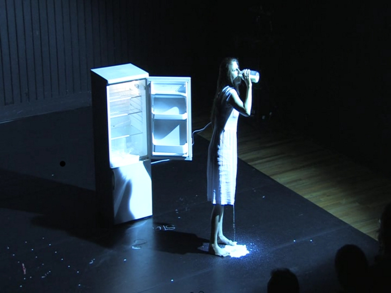 When I was making ONE DOUBLE BODY I shifted my understanding of the objects, as described above, to see them more as a matter – materiality per se. I see objects as the ultimate body-ness which we, as humans, can experience. Following that thread, I was threating the object more as a presence, then I was interacting with it. In the piece the chosen object was the fridge. I had a vision of including the fridge in the piece. Before that I wanted to include all the furniture we had in our family house, because I was not sure where we will live with our baby (at that moment we were desperately looking for the place to live). I wanted to do this, bring all the furniture we had, because the scene where the object plays the main role is actually the moment of the Real. In this moment “door would open” and life would enter. The door is a metaphor for the fissure I wanted to make – a cut in the verbal and symbolic field I have created in the two scenes before. At the end I chose for the fridge because somehow this object was containing the essence of all the other house objects. When we have moved in our temporary flat, there was no furniture, and first we had to buy fridge, then washing machine, etc. The fridge was also revealing something about the inside space. In analogy to my womb from which the child is born, or in analogy to the intimate space I was building with the grid. I wanted to do many things with the fridge. But I end up in just simple sensing it, talking through it (as if I am talking from my own belly, by using the mic attached to the fridge), and opening it in the last scene. With the opening we hear my son's first cry when he was born. That is an awkward and awakening image. Here is what I wrote about it in my last half-year report: “If the grid was standing for my human world filled with speech, the shadow was standing for the world of the Fish – speechless. But the last image (the scene with the fridge and excessive drinking of milk) is a moment in which these two worlds meet, finally. DOUBLE BODY is incarnated in this ONE image. What was inside becomes visible, what was outside is showing its inside. The same happens literally on stage – the fridge opens and we see its inside, which we couldn't see before. The shadow light (3D square light), that was a space inside of the space, becomes part of a broader image (together with the fridge and whole space of the stage). It becomes in/on the stage (previously that space was the stage, as I was moving only inside of that space). I am opening the fridge (my womb), the Fish is screaming (being born) – the fridge becomes the fridge again (after my baby's cry we can hear only the sound of the fridge) – the inverted light (artificial day light – HMI light) comes on stage and while our shadows are growing (mine and fridge's) and while the light is filling up the space, I am drinking milk (instead of the Fish drinking my milk) but the milk is dripping excessively so I could be Fish (as there is no reason for a grown-up to be so unreasonable!!!?). Am I now the Fish, is the fridge now I? In dark we don't see, but we hear the drops of milk, falling heavily on the floor. There are no more wor(l)ds, just a trace of a thought that is slowly becoming rootless. ”