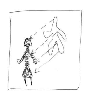 After creating the Prelude for a Causal Machine (showed on 23rd October 2010 in Theaterschool, Amsterdam), I started a daily studio practice. I was researching on the shadow but also practicing the grid. I would do the grid twice in one day and write notes (diary) about what happen or what ideas or connections came up. The practice of the grid became alive entity. Here is what I wrote about this practice in March 2011: “By practicing the grid I have discovered an interesting physicality/sensation in my back – my back became aware in a very specific way. It would spread inside and outside like one massive antenna, while I was progressing through space by making the grid. It had sensors all over itself, and I always knew where I am. It were sensing the air and the floor. With my other body parts I have sensed the whole floor, so many times. My body started to know the floor. The floor started to know my body. The history of my imprints on the floor was creating the density of the performance every time I would perform it. No matter how tired I was, or what was bothering me in that moment, every time I would enter the grid I would feel whole again. The grid had a purifying capacity – it was catalyzing my daily/actual dilemmas, issues, stories, needs, ideas and my history. The grid was making a funny order out of everything. It was like if the whole inside, emotional body, mental body, physical body, volitional body, became visualized and stretched out in the space of the grid. I remember, once I was dreaming that my spine is laying on the bench next to me, while at the same time I am normal and functional as usually. In this mystical sensation, in which something that is inside of me, my vital part, suddenly can be at the same time outside of me, I have recognized something crucial for my artistic practice. I think that in the grid I am finally managing to achieve what I call the active paradox. I am managing to exist on stage affected by the two opposite forces at the same time. This affection is a distraction from unnecessary load of aesthetics or judgment or doubt or fear. It triggers something real. Something that I can't control but at the same time it is me.