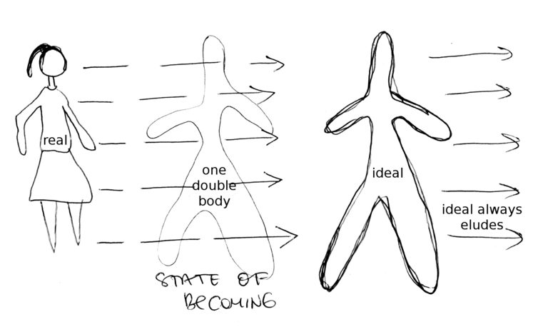 Body of a performer – performed body. Between them is always a tension. This tension is based on a desire and on the work of a performer. While instrumentalising her/his desire (to become the ideal-self) performer is transcending her/his private body and becoming changed. In this process the third body is created. The state in-between the real body and the ideal body is the body in the state of becoming. This body is never the same. This body is always in the process. As soon as the real body is dragged to the ideal body, this body emerges. Then the real body is out of our sights. We can hint the ideal body, but actually what we see is only the body in the state of becoming. What we see as a material reality is only one body. Because of its processual nature, duality and potential that it contains, this body I call ONE DOUBLE BODY.
