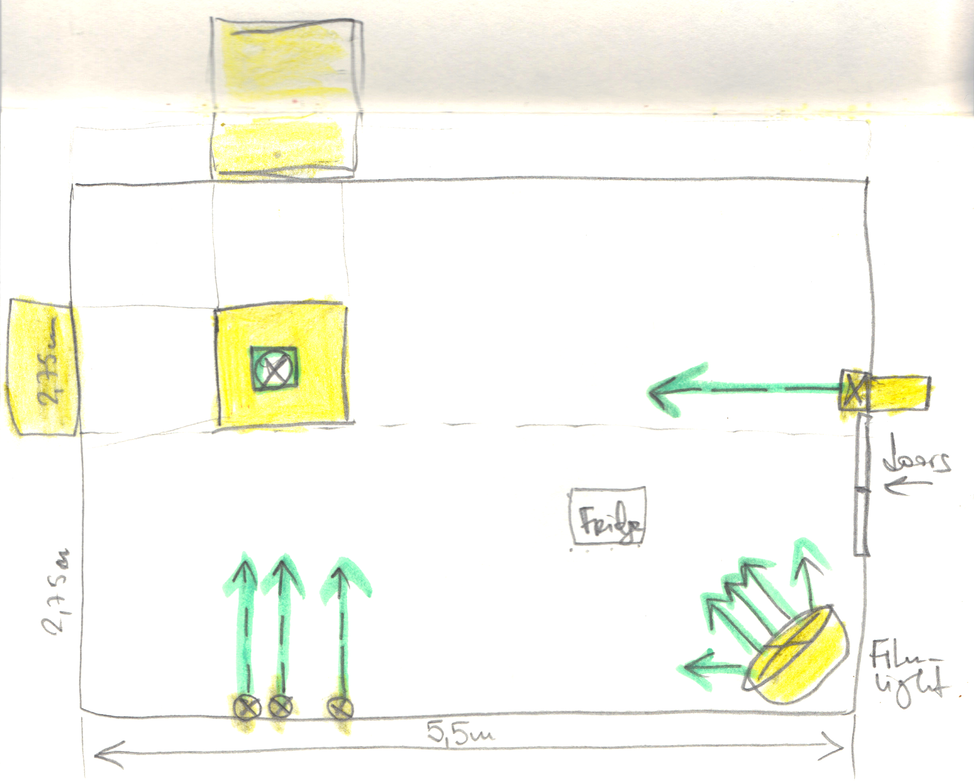 The use of the light in ONE DOUBLE BODY was also a task of integration. How to use light within the causal machine concept? How to integrate light into the causality – like everything else: performers, space, time, bodies, room, etc? How not to use light just as a decoration (aesthetic information) or a technical support or just because we know we should use light? This research I have already started at beginning of the winter 2010. I set some basic conditions, light coming from 3 different sources and creating 3 different projections (shadows) of the body in space. The beginning idea was to use this setting to help me to lift the perspective from 2 dimensions of the floor/image (in the grid scene) into 3D space of the studio/room/stage. Also I wanted with these lights to create another space. Space inside of the space. Space that is the inside. An elevator of light into some other space, that is here, but also not the same here as the scene before (the grid). I wanted, as I always do, to use very simple means. Low-tech. Though, I have tried to use video projector. Just to tease my own standards. And it showed very soon that technology is unnecessary complicating everything and it doesn't bring any new quality. As I am working with the body of each of the performance elements, the same is with the light. Light has a body, and I have started looking at it. With Jeroen de Boer I could look at this body closely. Which reflectors/lamps create which kind of light? Under which angle this light falls on the wall/black curtain? How does a certain material reflect a certain light? What kind of projection creates particular light? How sharp or soft? What kind of frame for the lenses I want to use? Which filter colors to use? How reflectors/lamps stand in the space? etc.
