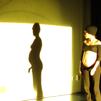 Later on it became important how does the combination of these lights and projections work, and how can I use it for the causal machine composition. I started by using the same principles like in the Mirror (stage) but very soon I have realized that these principles were not enough, because, as some of my collaborators and mentors have noticed, the magnetism of the shadow was dragging me deep into myself and that have resulted in a very hermetic material. How to open the shadow-production for the audience to be able to engage with it? I have started to look not only what kind of shadow I am creating, but also how is my body in the space, and how does the whole composition look like. So I have invited people to have a look on what I am doing and help me see myself also from the outside. Some of the people I have invited to manipulate the lights, because I have discovered that the whole picture depends so much on the person who is manipulating the light. This person would be a co-creator of the performance. I wanted to look for visual artists, or artists that are both working in dance/choreography and in visual arts. They could be able to judge the production from the inside and from the outside, as supposedly they would be both familiar with the image (making) and with the performing (being an image). Last rehearsal before delivery was on 26th of February (I have delivered a baby on 8th of March*glossary: pregnancy). I was in the studio with Adam Beni, Gilad Ben Ari and Dragana Bulut. Adam and Dragana did each one run of light manipulation while I was performing. I was very slow because very heavy, but this gave a special quality to the performing. After delivery I have done runs with Adam as light-manipulator, but also Kyd C, Renee Copraij and Nina Djekic. After delivery my performance have changed. I was much faster and more diverse in movement production, but less settled.