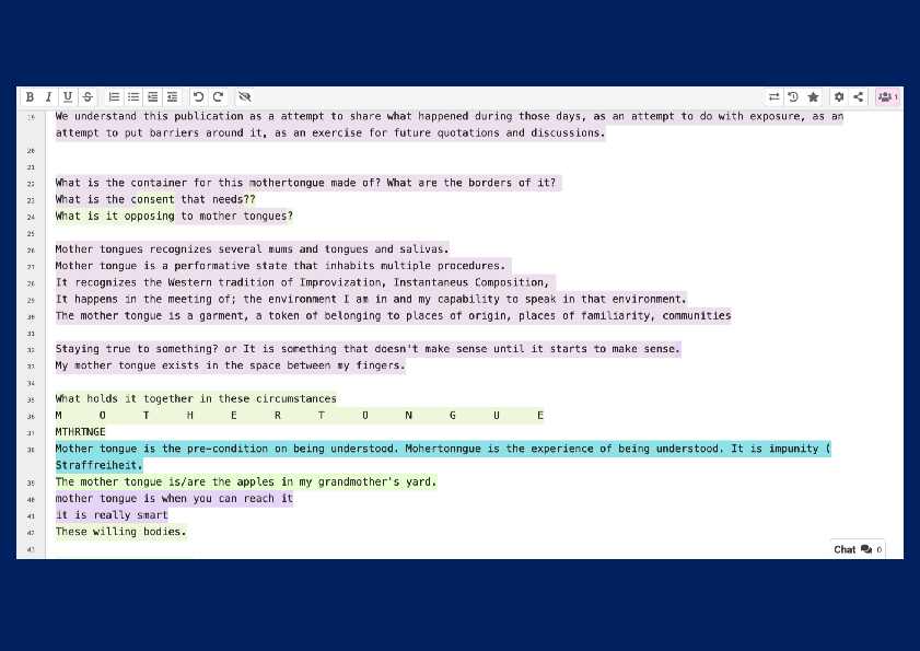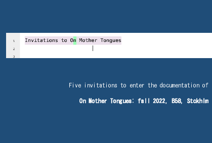 Description [en] Collaborative exposition with CC4r license in the frame of a workshop focus on monther tongues, performer skills, translations, translinguicism. As a first proposal, caterina's invitation to the workshop stated this: "This proposal invites you as co-researcher to develop a workshop about mother tongues and translations. Aiming to reflect on the performer skills, from our mother tongues to trans-linguicism, the sessions will develop obfuscated story-telling to deal with questions around the untranslatable." Documentation of the 'On Mother Tongues' workshop. On Mother Tongues happened as a result of an invitation from caterina daniela mora jara to spend some hours in the same dance studio with Mariana Costa, Stella Kruusamägi, Andrea Diaz, Yari Stilo, Robert Malmborg and Martin Sonderkamp. The workshop took place the first week of the fall semester 2022, from 29th August to 3rd September (14h till 17h), and 1st October (11-16h) in the Department of Dance, located at Brinellvägen 58, 114 28 Stockholm, Sweden.