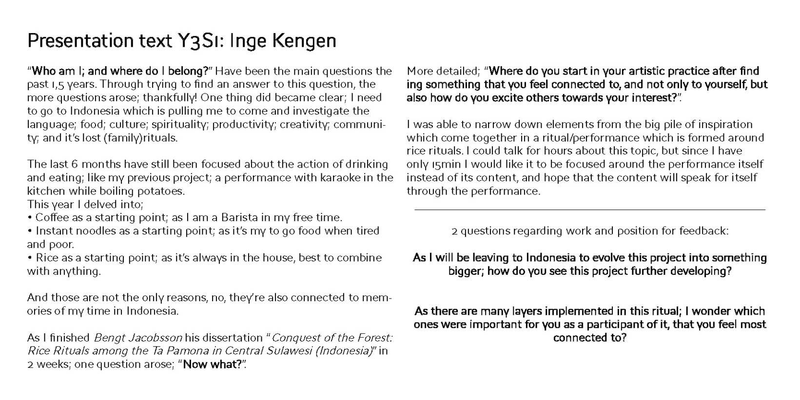Your theoretical research on rice is very rich and layered which is great but can also be difficult to render into a work. Nevertheless, you were able to narrow down elements to create a performance piece combining text, sound, smell and taste. You engaged the audience through sensoriality and storytelling.