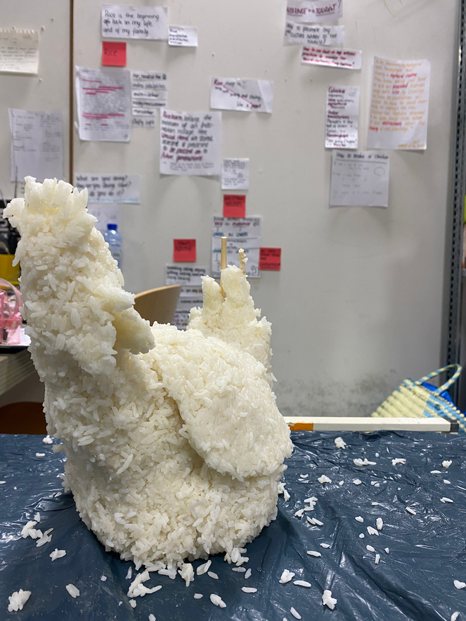 As a starting point for creating, I decided to take a very literal approach. The rooster is the startingpoint of planting rice, so I created a rooster out of rice, just for the sake of practical creation.