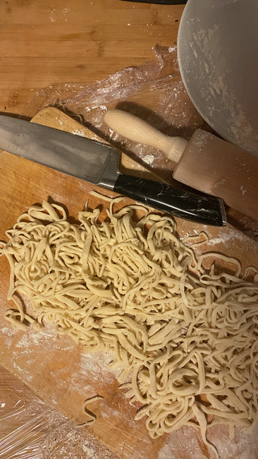 -- below you see pictures of the table where we made the noodles, the side dishes for with the noodles, and the noodles we eventually made. (A LOT)