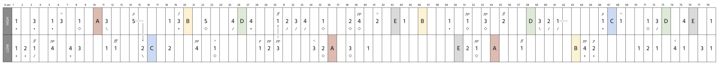 As we can see in the graphic score above, the improvisers are asked to follow a two-part grid, indicating high and low registers; number of sounds to be played in each six-second bar; articulations and “playing modes” represented by symbols and letters respectively. Each playing mode corresponds to a technique or instruction whose interpretation is completely left to the musicians: A=loop, B=long sound, C=improvise between c and d#, D=grains, E=free improvisation. When cued to be performed (usually by a conductor), they function as “points of focus” which the musicians have to remain until cued to stop. Once the end cue has been given, players can choose the point in the score they wish to continue from, provided that it is after a mode identical to the one they just finished. This creates a variety of possibilities where parts of the score can collide with each other depending on the conductors’ and musicians' decisions. The total duration of the performance is decided by the conductor.