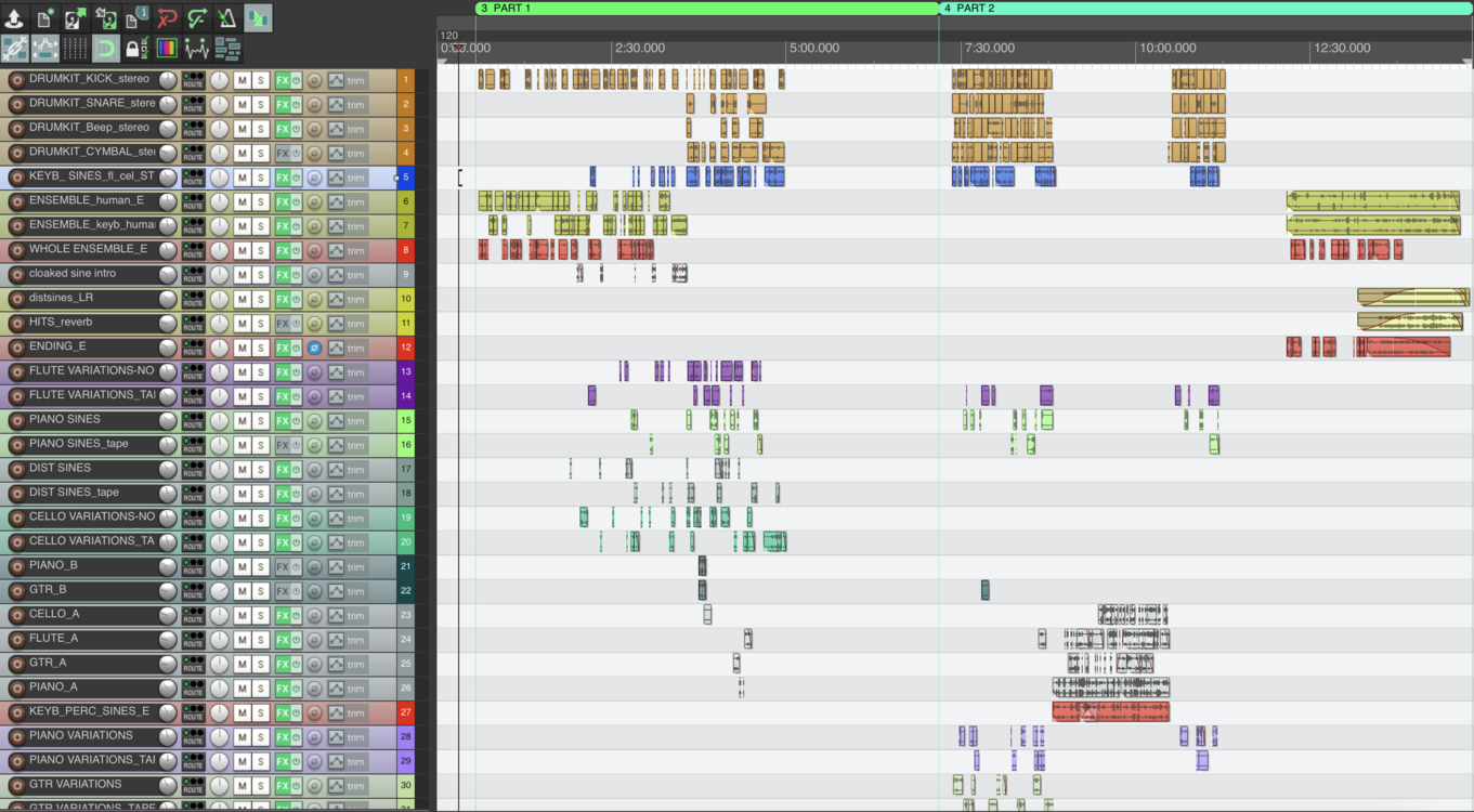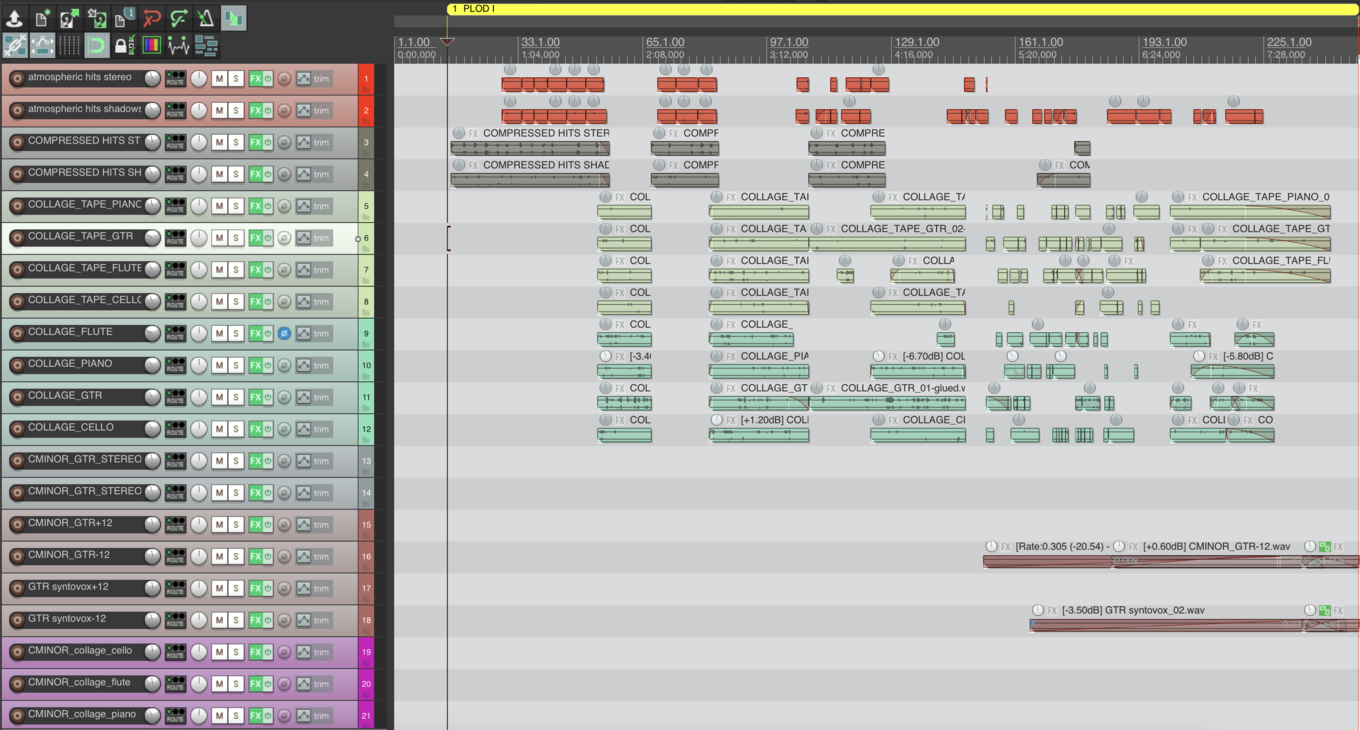 Opposing the first process, the second structure is a mashup of “chopped-up” instrumental recordings (light green tracks), generated by a voltage-control patch which “reacts” to the amplitude and frequency values of isolated instrument tracks. Each “chopped instrument” underwent a second generation of transformation which was superimposed on the first one (dark green tracks). This time, I chose to feed them through a tape machine and “perform” on it to alter their pitch and envelope contour - adding expression and density. Towards the end, a third group of slightly different sounds appears and functions as a transition to the second part of the composition, “plod II”. This group consists of several stretched material; again, spontaneously chosen from the group of percussive sounds heard in the beginning of the piece (red tracks), and a long upward glissando (almost 3 minutes) achieved by gradually increasing the playback speed of a sound with a steady tonal character (brown tracks).