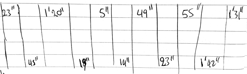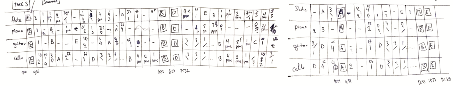 The production process for “cloaked” was more systematic compared to the previous pieces. I began by writing down the path every musician took while performing the score, in order to create a “performance map” of the whole ensemble for take 3 (see figure below). As a result, I had an overview of the number and qualitative characteristics of the sound materials for each six-second bar of the score. This information would then be used as a “blueprint” for the construction of the two pieces. It was clear to me from the structure of take 3 that the two sections created by the points where the playing modes were cued (from the starting “E” to “D” at around 7’; and from this “D” to the ending “E”) would shape the two parts of “cloaked”.