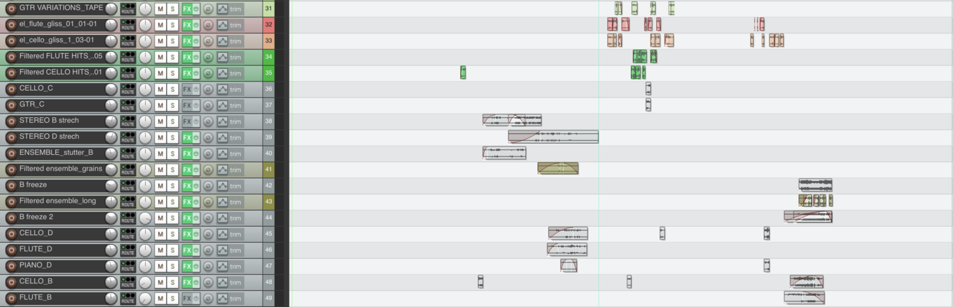 The next step was to follow the structure of take 3 and make my own interpretation of the materials performed by each instrument. So, for every sound in each bar, I created an electronic equivalent, either by transforming the corresponding instrumental sound (see tracks 6, 8, 11-14, 19-26, 28-49 in Figure 5) or by replacing it completely with a synthetic one (see tracks 7, 9-10, 15-18, 27 in Figure 5). During this procedure, I was sometimes faithful to the written numbers/letters/articulations and sometimes acting completely intuitively if I felt that the music demanded it.