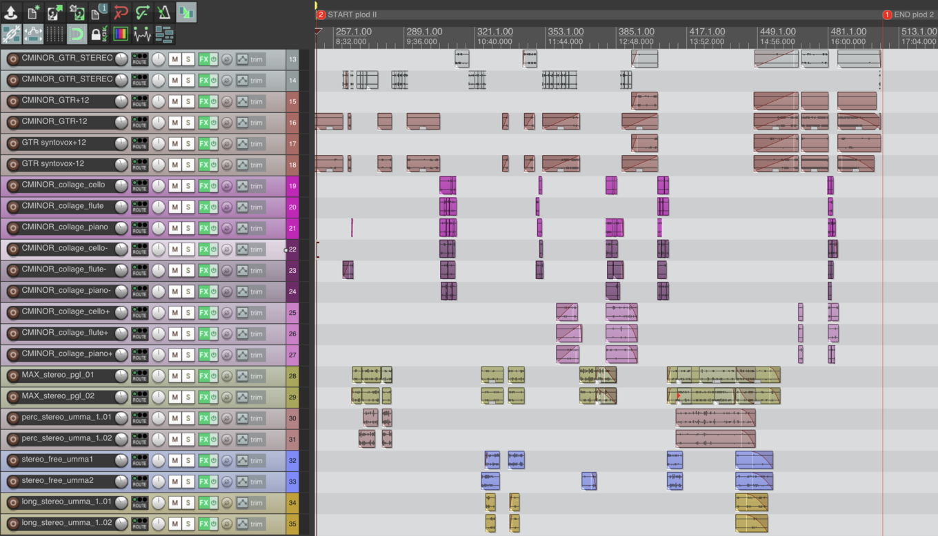 “plod II” is organised in a similar manner. Two processes with different characteristics switch places or collide spontaneously throughout. One of these is made of “shuffled” fragments of sustained sounds varying in duration and their pitch-shifted (one octave higher and one lower) counterparts (see tracks 13 to 27 in Figure 4). These sounds are derived from playing mode “C” (players are asked to improvise between c and d#); thus, every fragment retains its tonality around “c-minor” but continuously varies its timbre. The other process consists of collages of instrumental sounds (see tracks 28 to 35), with mostly percussive and noisy sonic character. These were made using combinations of analogue and digital patches [4] which were “performed” by myself, so that parameters like fragment duration and density, envelope shape, panning, reverberation, and others could be shaped in real time.