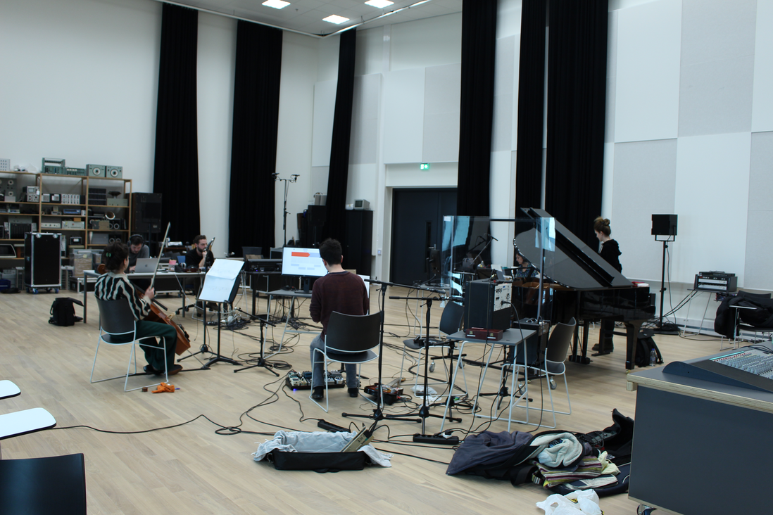 On 20 March 2022, three takes of the score were performed and recorded in the New Music Lab at the Institute of Sonology (Royal Conservatoire, The Hague). The ensemble was "conducted" using visual cues projected on two screens in front of the players. With this setup, I was able to shape the performance in real time, with very little influence over the sound material being generated (see Figures 1 and 2).