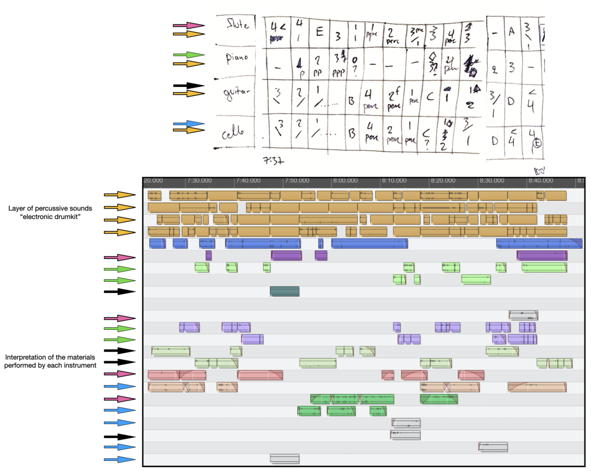 Both examples mentioned above resonate with the procedure I followed to create the music for my album. The idea of creating something which would work as a demo to be put through a transformation process led me to compose an open score for four improvising musicians (flute, prepared piano, electric guitar, cello) which would function as the very first step of a compositional process rather than being part of the final stages of realising a musical result. The performance of the score would be recorded and subsequently the recorded materials would be used as a basis to create the studio compositions which make up the album.