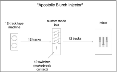 One of the patches I did was inspired by Frank Zappa’s DIY technique to achieve the sound collages in the tracks “Nasal Retentive Calliope Music” or “The Chrome Plated Megaphone Of Destiny” amongst numerous other cases in his early albums with the Mothers of Invention. This was done partly by splicing pieces of tape and partly by using the “Apostolic blurch injector” [5]: a custom made hardware device (built by a studio technician) which allowed him to switch between each output of a 12-track tape machine in a more improvisational way and at the same time being able to record the result through the mixing desk (see Figure below).