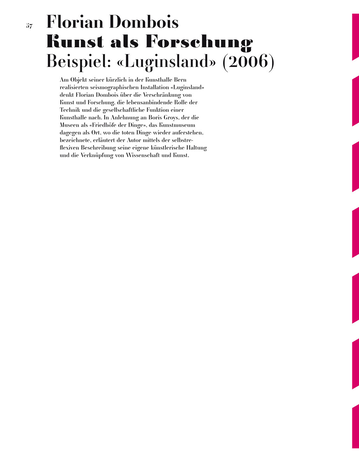 Dombois, Florian: "Kunst als Forschung. Beispiel: Luginsland (2006)". In: "Doing Theory - Ein Jubiläum", 31 - Das Magazin des Instituts für Theorie der Gestaltung und Kunst 8-9 (2006) 57-64. (download)