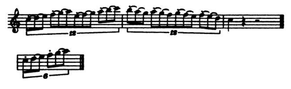 It is important to highlight a small contradiction regarding unmarked or unarticulated phrases; besides the statement that in the absence of written articulation, one should detach the notes with soft tonguing (“D”/”Tu”), Vanderhagen also implies that such phrases could be articulated freely, and even provides specific examples that could be used in the absence of written articulation instruction depending on the mood and tempo of the piece; Thus, for a moderato phrase, he suggests using “…the most beautiful and the most useful” combination of two slurred-two detached notes. He consistently shows a preference for this articulation in all three of his books. For Allegro phrases, he suggests slurring two-by-two, and for very fast tempos he recommends slurring over the entire measure.