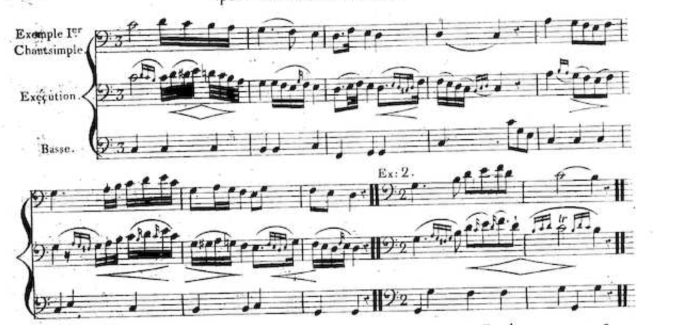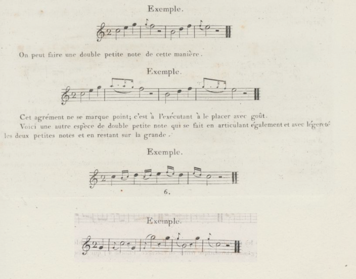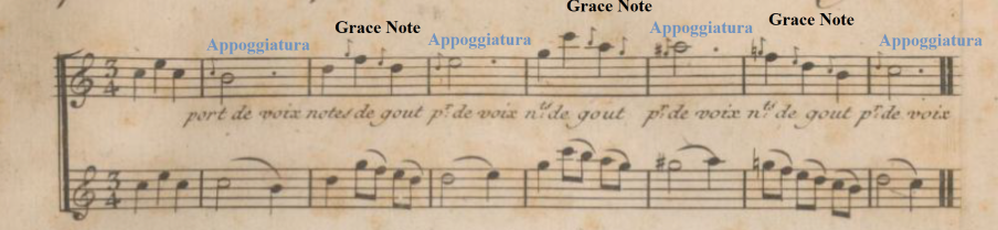 Vanderhagen’s last method also highlights the grace note in the same manner, providing similar examples of the port du voix. This time, however, he added a comment regarding the execution of the ornament:
