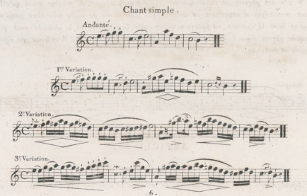 Unfortunately, Vanderhagen did not discuss the topic of melodic variations and alterations, cadenzas, or improvisation as means of embellishment and self-expression. This practice was incredibly significant to solo performers throughout the eighteenth century, and well into the nineteenth century on occasions. Contemporaries like Lefèvre and Ozi, on the other hand, offered examples of this performance practice (examples 8.15-8.18).