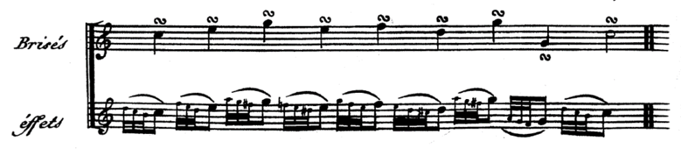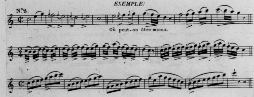 "Any small note flowing over one or more large notes flowing either by two, by three or by a greater quantity together, it is always necessary that the one which begins the flow, is expressed by a small inflection, in order to make the separation of slurred notes from unslurred ones clearly heard."5