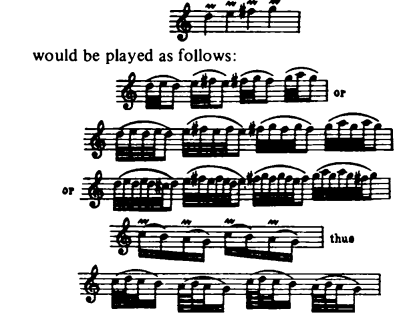 In his two earliest methods, the writer speaks highly of the grace note, saying that it is the most tasteful embellishment. However, this comes with a disclaimer that one should only use it in solo pieces and passages. Never to be employed in orchestral tutti, or in any case where two instruments play the same melody.