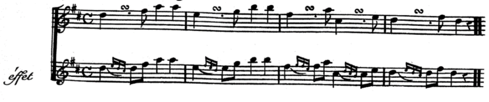 This definition is consistent with that of Leopold Mozart. Nevertheless, other writers held different approaches to the mordent; Lefèvre merely stated that it is “nothing more than a short trill”9, while Ozi provided the following example (8.13) for executing the ornament.10