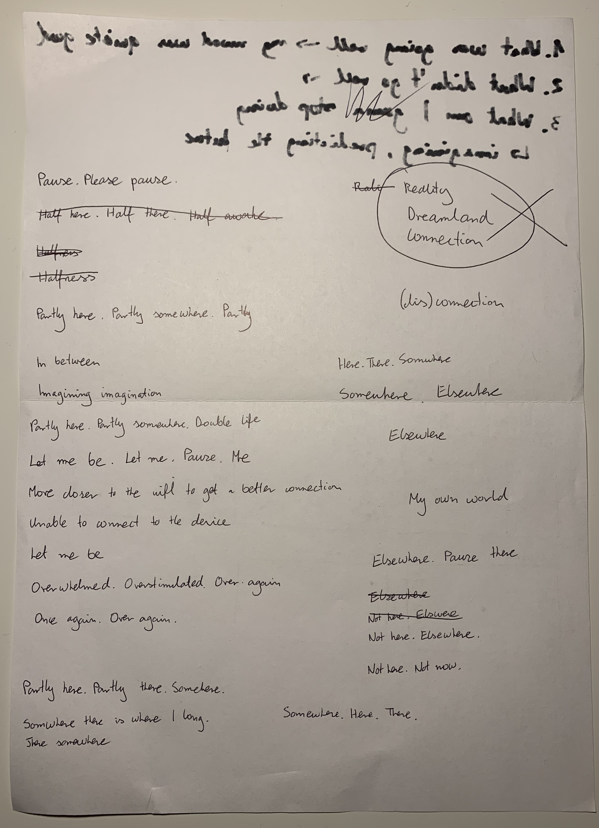 What I did was that I went through all the writing I have - my notes from videos, my reflections as well as the feedback I got from my peers and coaches - and I worte down the words that I found interesting, the ones that connect most to my topic and the ones that were repated. I started with writing them all on my computer but that did not really get me anywhere so I grabbed a piece of paper instead. From the list of words on my computer I wrote on the paper only some of them, the ones I felt most connection with. Then I played with them - I was arranging them differently, adding words, taking words out, it was really like a word play. I also searched for synnonyms for some of the words becasue they might bring me some inspiaration. At one point I got to the word "somewhere" and I felt like this is it. "Somewhere", "elsewhere", "here", "there", "not here". What I liked about these words is that they do not precisely describe a place, they give you a general idea but they are not specific. This is somehting that connects with my dreamland, it is in my imagination, it is in my head, I am in a different state that I cannot really describe, it is just "somewhere there". Later I asked one of my friends for their opinion and she said that because I do not give the specific place it makes her curious where it is, it makes it mysterious and thus she would want watch the solo to find the answer. And this is how I ended up with "Not here, elsewhere".