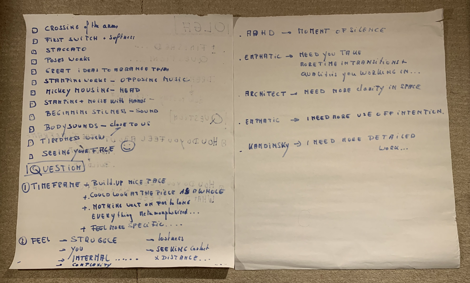 In this whole process I got a lot of feedback - in Dario's class, in Dirk's class and also from friends whom I invited to watch my rehearsals and run throughs. The feedback always helped me to see if I am on the right track, what I should work on further, what works and what I should keep etc. At the same time it was very overwhelming - there were so many perspectives given, sometimes what worked for one person did not work for another one and it made me really lost at times. I did not know what to take, what to leave, what to do with it. With time I realized that I cannot satisfy everyone and that some will like/understand my solo and some will not and that is ok. I should take and apply the feedback that I feel will support my solo.