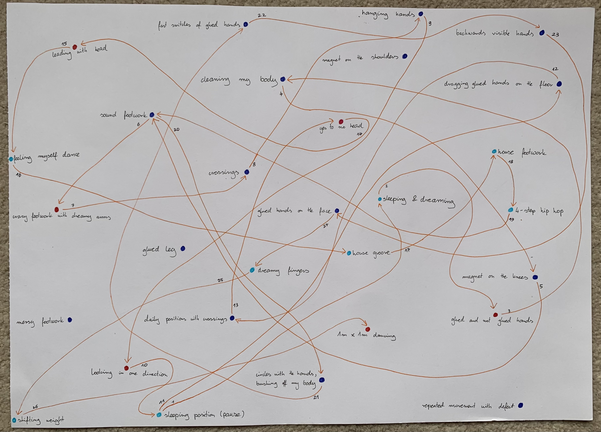 sleeping and dreaming -> hands glued and not glued to the ground -> cleaning my body, waking up -> magnet on the knees -> footwork -> dropping on heels from toes -> crazy footwork -> crazy footwork with dreamy arms -> hands covering the face -> fast switches of the hands -> circles with the hands, brushing off my body -> daily positions -> yes to no head -> falling and laying on the floor (like in the beginning), pause -> dragging my glued hands on the floor -> intense crossing with hands -> glued hands -> glued leg -> house steps footwork -> the 4 hip hop step -> letting my head loose -> shifting weight -> feeling myself -> looking in one direction crossing -> 1m x 1m -> repeated movement with defect