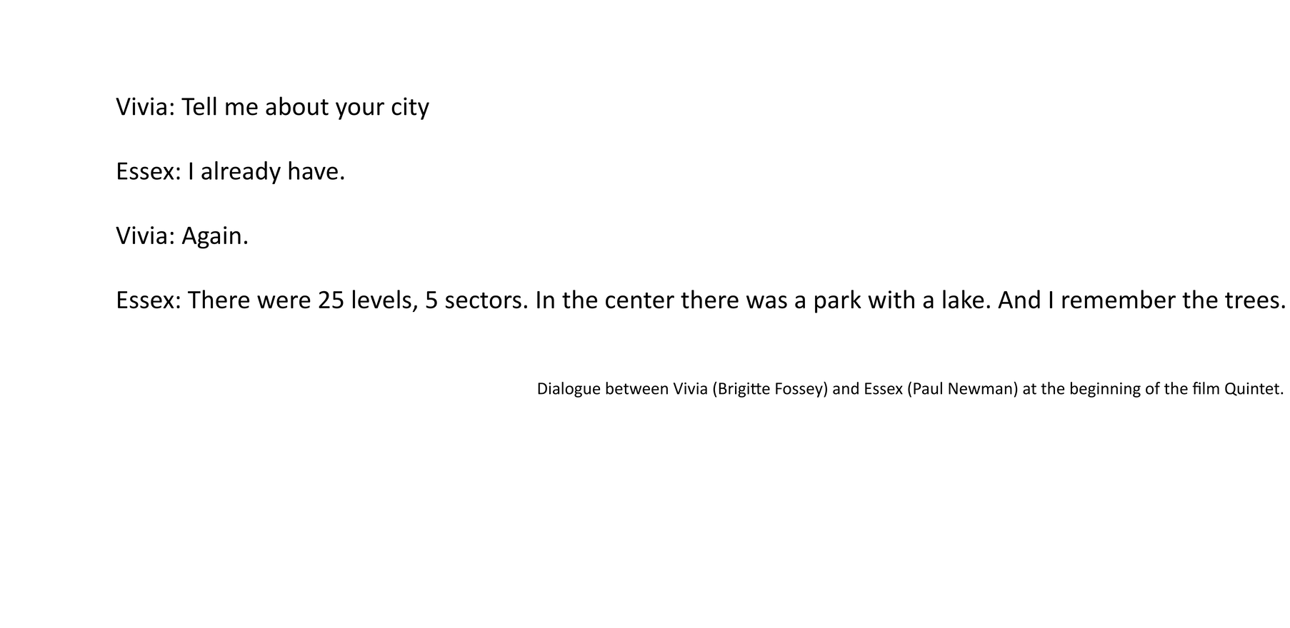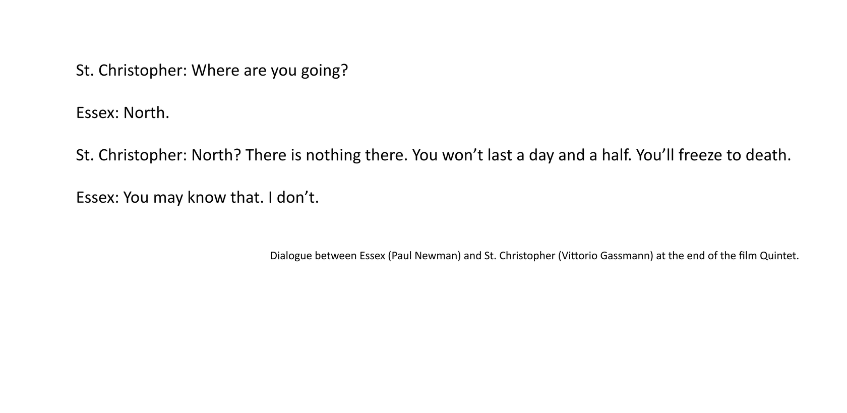 In the film's diegesis, Quintet is a participation game popular before disaster struck the world. It is still played and it consumes most of the inhabitants time in the city. There is nothing else for them to do but wait to die of starvation or cold. When, at the end of the film, Essex discovers that the rules of the game have changed and that the goal is to kill off one's opponents, he decides to leave the city, alone. The film ends in the same landscape as it began with the solitary Essex walking into the whiteness of the snow.