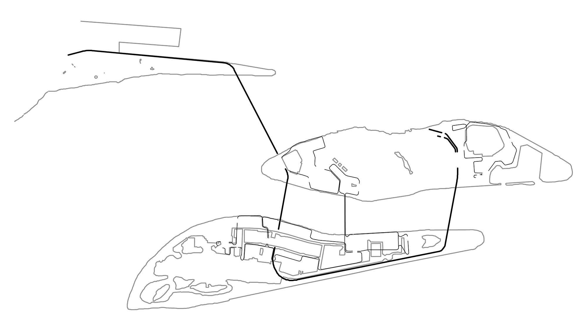The map has three layers: islands shows the islands Notre-Dame and Sainte-Hélène as they were experienced when visited in the fall of 2011; diegesis ia a map of the fictional, post-apocalyptic city where the action of the film Quintet takes place; terre des hommes is a map of Man and his World, the themed site of Expo 67.