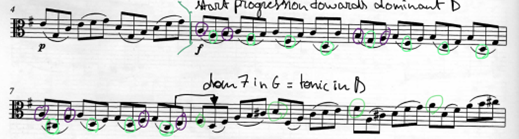 Fig. 32: Prelude – two intertwined lines (b5-8) marked in purple and green circles – purple: descending scale and green: scale-like effect – both lines lead to the D in b8 ( purple E descends and green C# ascends)