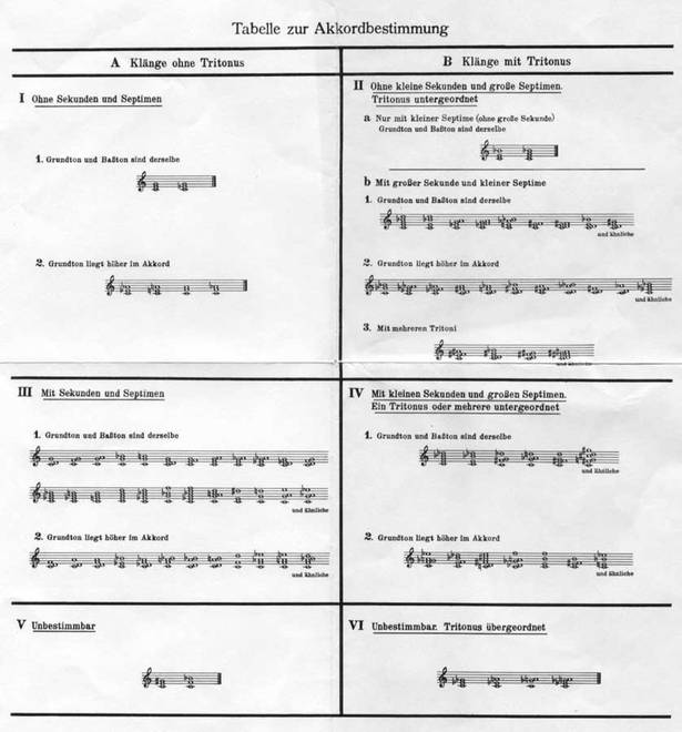 When considering where Hindemith got his inspiration for his own personal harmonic theory, we have to take into account the wide range of repertoire he performed as a member of the Amar Quartet. This repertoire regularly included octatonic and whole tone collections as well as the modernist aesthetics of his contemporaries Stravinsky and Schoenberg. Next to this, although there’s no clear evidence of this, many sources mention that a clear influence from others such as Heinrich Schenker (1868-1935), Hermann von Helmholtz (1821-1894) and Boethius (middle ages) can be found, as they believe he built his ideas with the methodology and synthesis of their theories in mind.3 It is also believed that his reading of late 19th-century psychology, by writers such as Carl Stumpf (1848-1936) and Theodor Lipps (1851-1914), lead Hindemith to some more general conclusions about musical perception.4